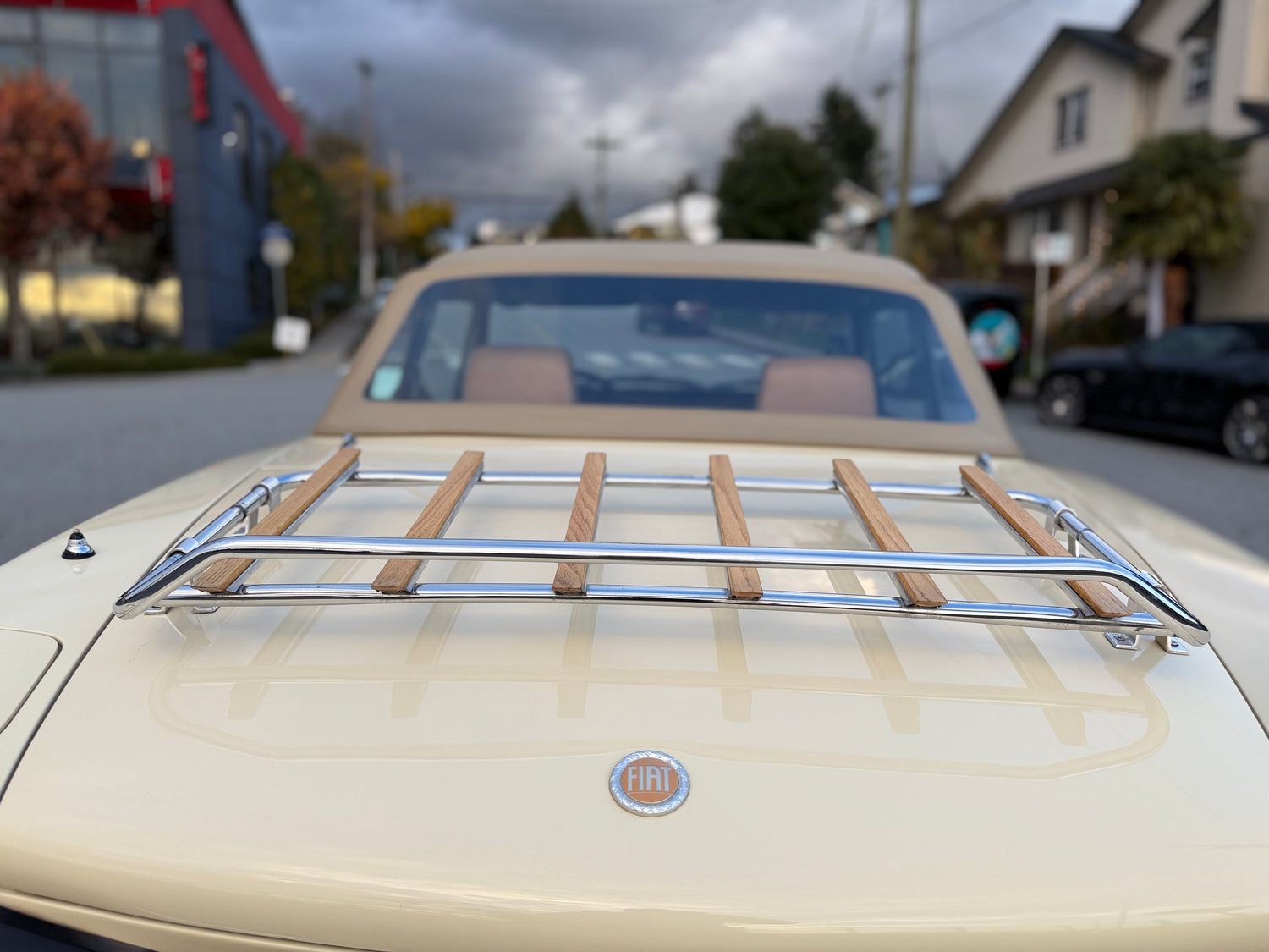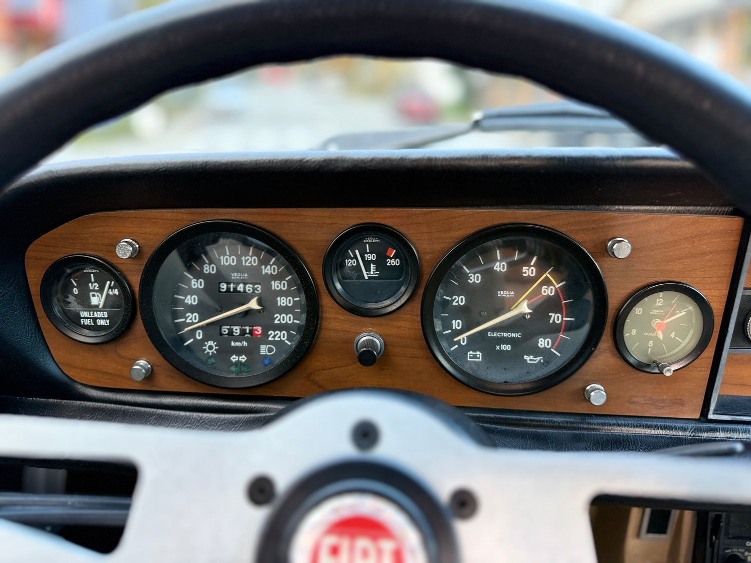 Equipment includes a tan soft top, 13″ Cromodora alloy wheels (high-pressure cast magnesium alloy wheels), four-wheel disc brakes, woodgrain interior trim, a Ferrero leather-wrapped steering wheel, and Veglia Borletti instrumentation consisting of a speedometer, tachometer, clock, and Fuel gauges. The car is equipped with a luggage rack on the trunk lid, and a leather cover which was a common accessory for classic sports cars.