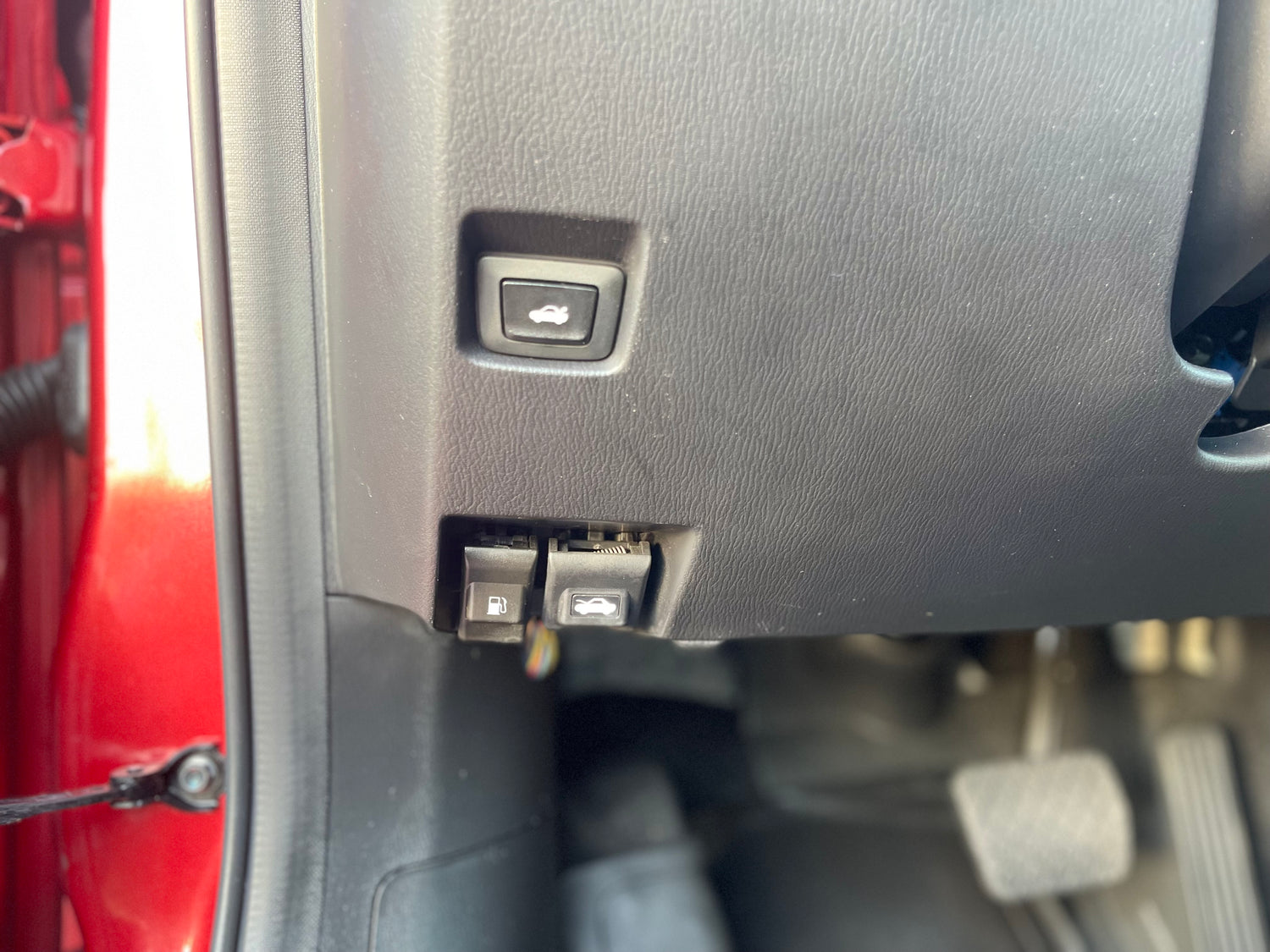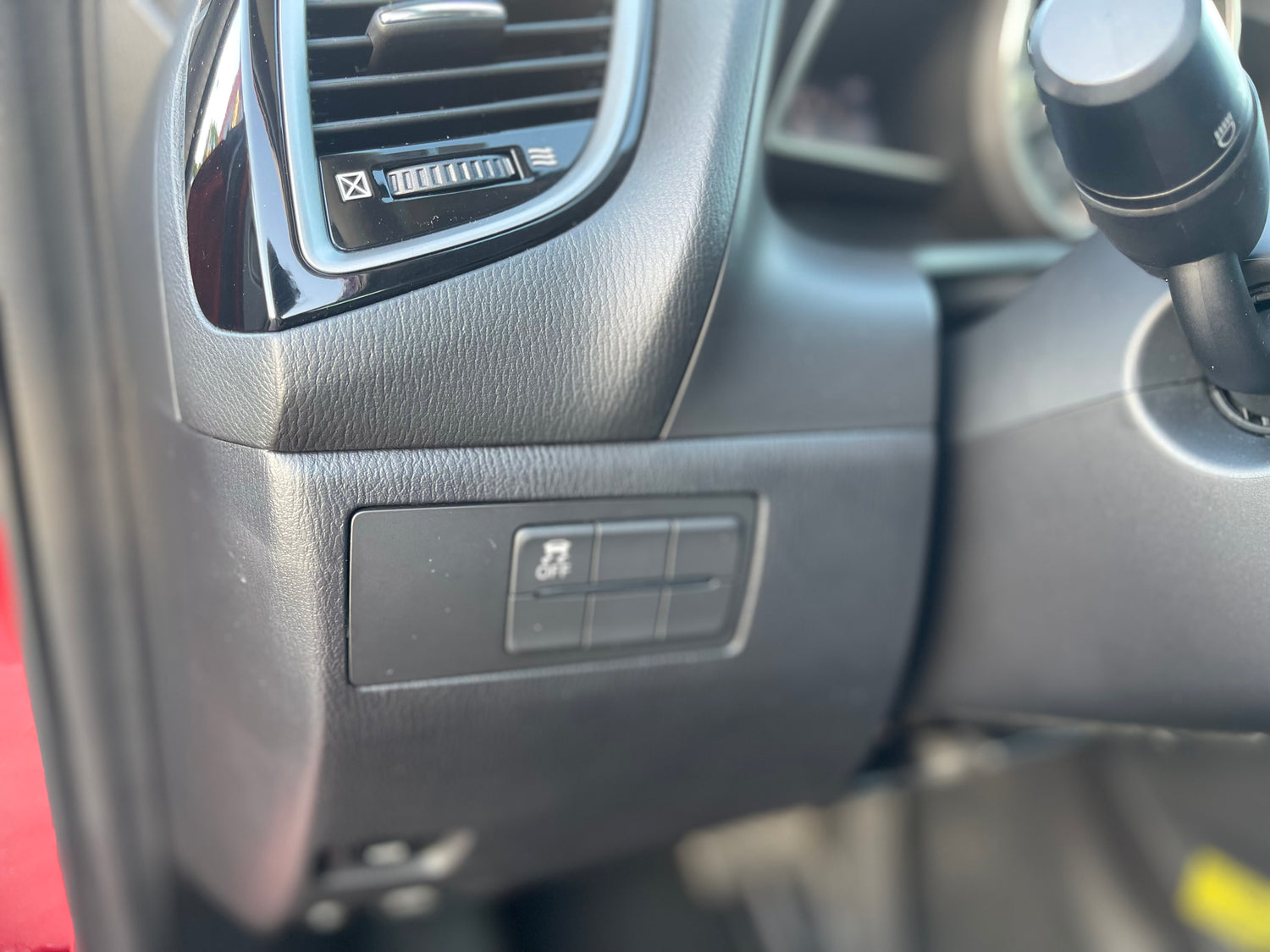 -leather-wrapped steering wheel with red stitching